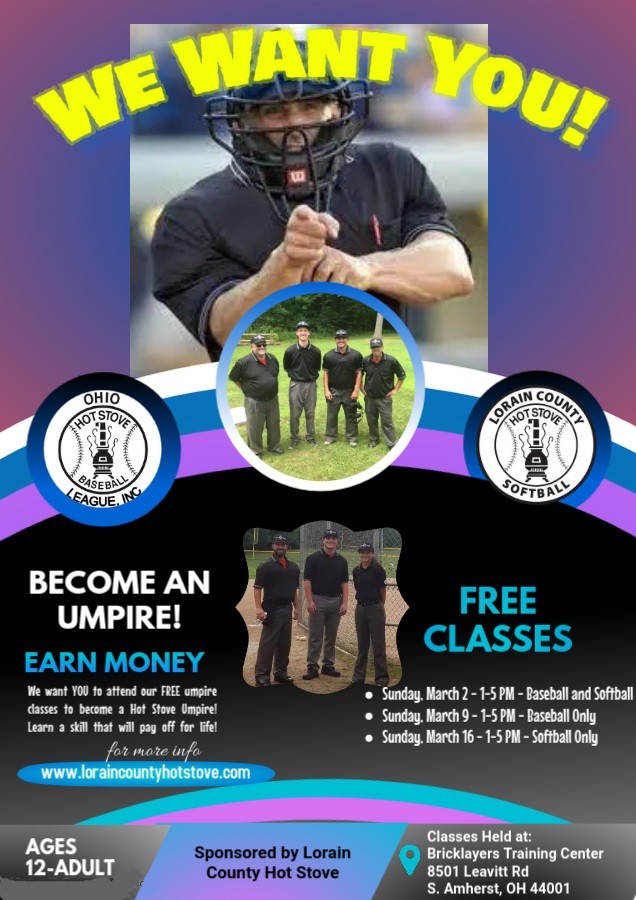 Sunday, March 9, 2025: Baseball Only and Test Date - Baseball-specific rules, mechanics and other information are reviewed. Ohio Hot Stove Baseball Umpire Test will be administered at the end.