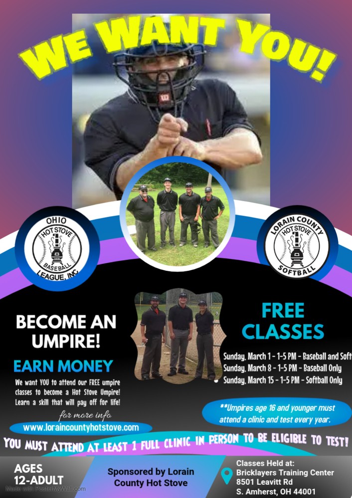 Want to become and umpire? Are you already an umpire and want to work Hot Stove games? Good News! Our FREE umpire clinics will be hosted for baseball and softball umpires the first 3 Sundays in March, 2026.